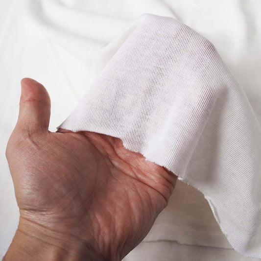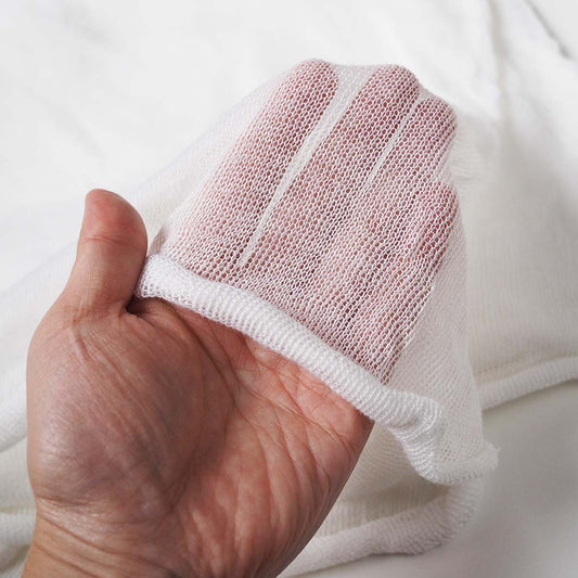 ミートラッパーの素材は、レーヨン100%です。生地を編み立てる機械に使用する潤滑油にまで食品で使われている油を使用し、最新の注意を払って製造しています。